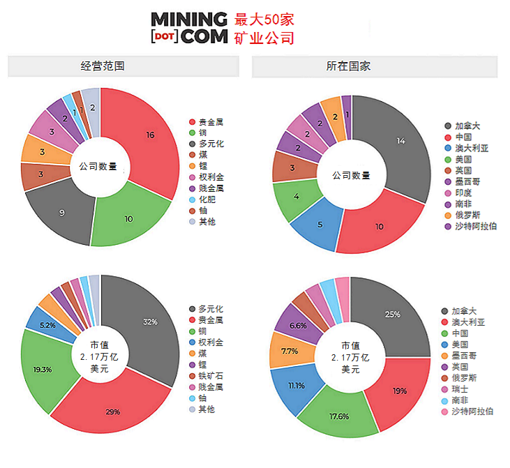 自设立该榜单以来,Mining.com全球矿业50强榜单一直由必和必拓和力拓两家矿企领衔,这两家矿企是仅有的市值未低于1000亿美元的矿业公司(尽管偶尔有波动)。如今已经有5家矿企市值超过千亿美元。