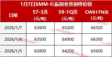 【SMM价格】2026年1月7日长振黄铜棒价格