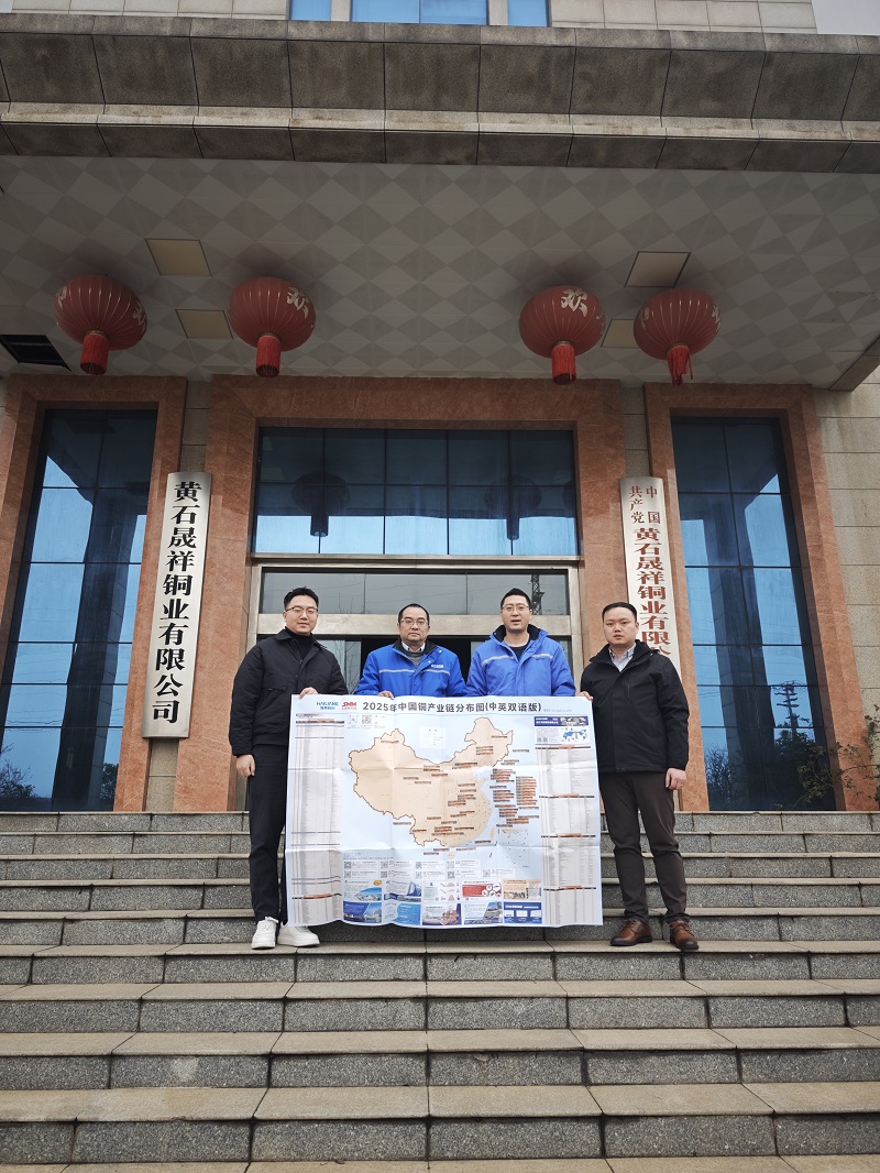 1月5日,上海有色网信息科技股份有限公司(SMM)大数据总监叶建华、 SMM营销部副总经理&铜事业部总经理马瑶、SMM铜事业部副总经理任杰一行,赴黄石晟祥铜业有限公司开展实地走访与业务交流。晟祥铜业董事长冯俊率副总经理肖军、营销总监何海明、营销经理左文等核心团队成员,对 SMM 一行予以热情接待。