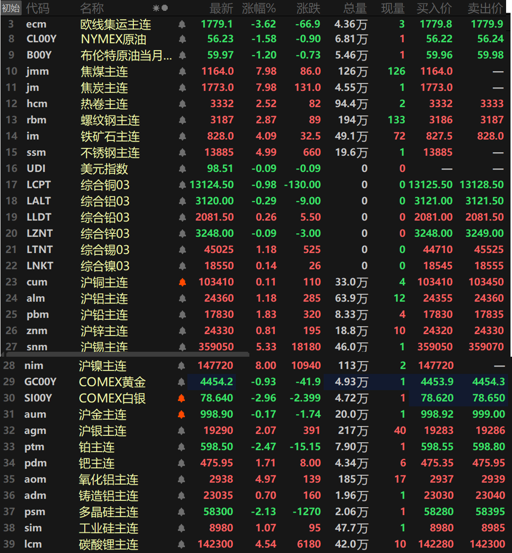 此外,碳酸锂主连涨4.54%,工业硅主连涨1.07%,多晶硅主连跌2.13%。欧线集运主连跌3.62%报1779.1。