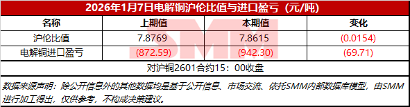 2026年1月7日电解铜沪伦比值与进口盈亏【SMM价格】