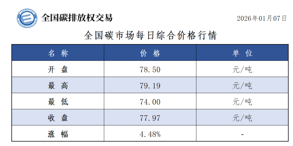 今日全国碳市场综合价格行情为: 开盘价78.50元/吨,最高价79.19元/吨,最低价74.00元/吨,收盘价77.97元/吨,收盘价较前一日上涨4.48%。