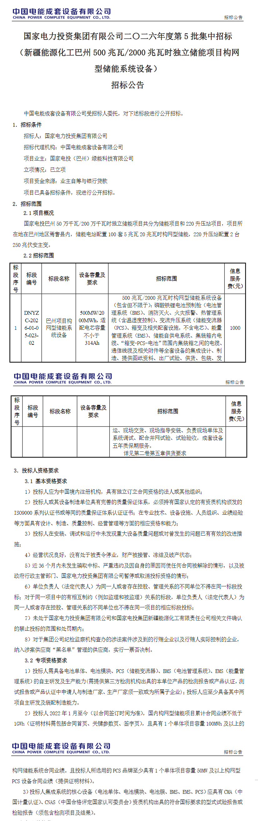北极星储能网讯:2026年1月7日,国家电力投资集团有限公司发布新疆能源化工巴州500MW/2GWh独立储能项目构网型储能系统设备招标,此次招标分为储能项目和220升压站项目,项目所在地在巴州地区焉耆县内,储能电站配置100套5MW/20MWh构网型储能,适配电芯容量不小于314Ah,220升压站配置2台250兆伏安主变。
