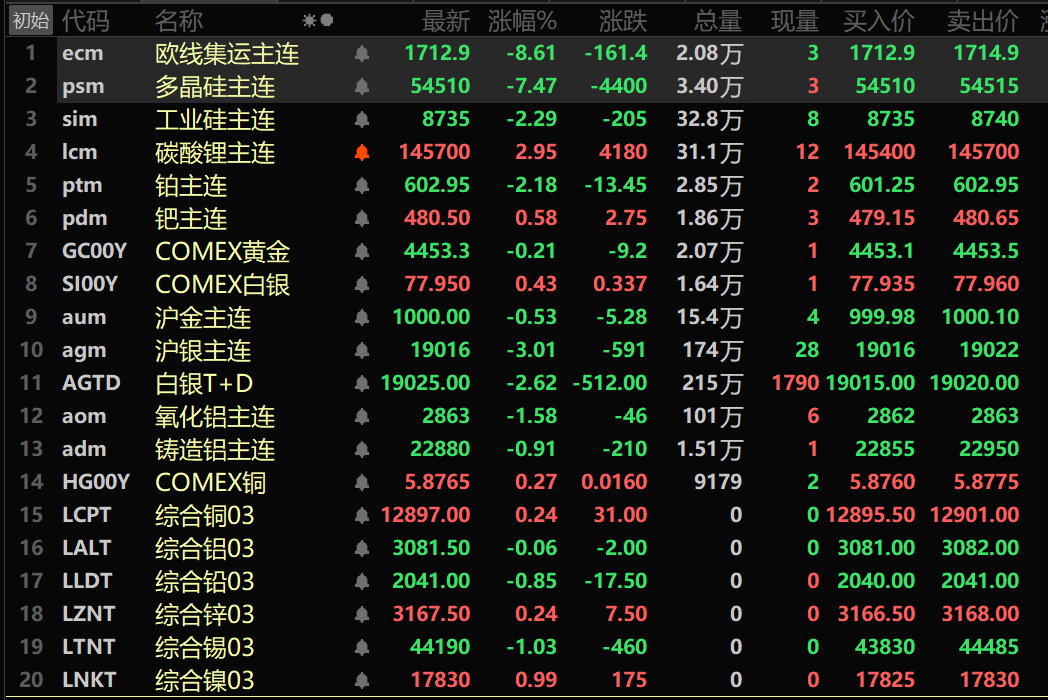 此外,铸造铝主连期货跌0.91%,氧化铝主连跌1.58%。碳酸锂主连涨2.95%。工业硅主连跌2.29%。多晶硅主连跌7.47%。