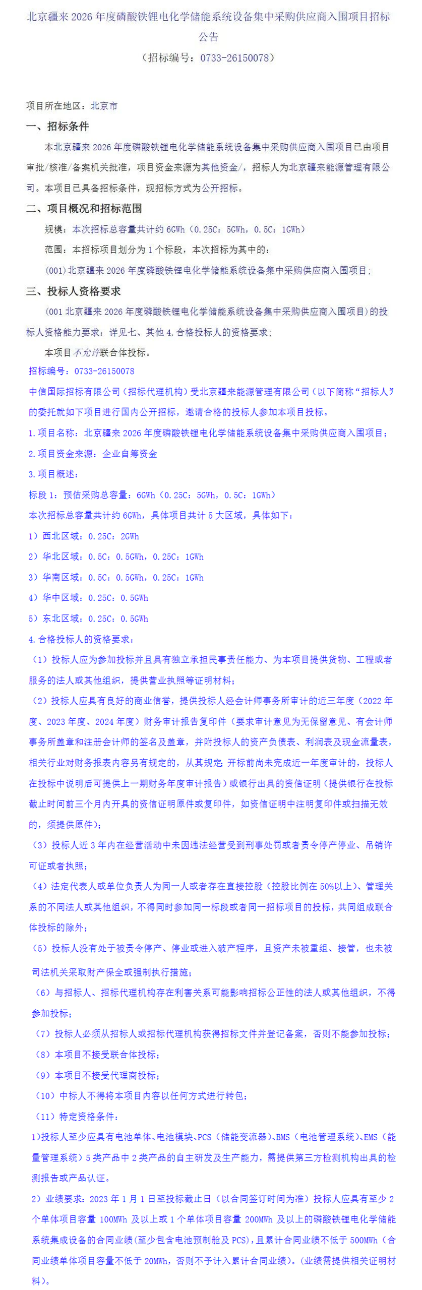 北极星储能网讯:2026年1月8日,北京疆来能源管理有限公司发布2026年度磷酸铁锂电化学储能系统设备集中采购供应商入围招标,本次采购需求共覆盖5大区域合计6GWh,其中0.25C即4小时系统全面覆盖,需求共5GWh、占比达83%;而0.5C即2小时的储能系统集中在华北和华南区域,总需求仅1GWh,占比仅17%。