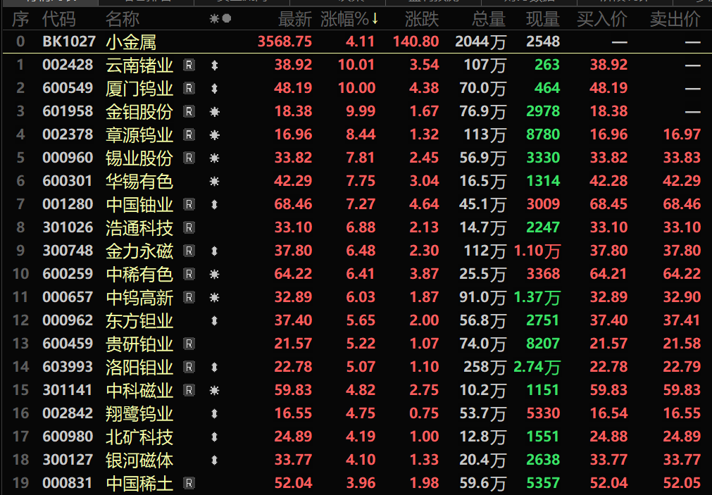 节后归来,钨价受多重利好因素共振提振:市场对节后补库需求的预期持续升温,钨原料现货供应维持偏紧格局,叠加多家钨冶炼企业相继上调长单报价,多重支撑下,钨价自1月6日起再度开启上行通道。此前黑钨精矿在2025年创下的460500元/标吨均价历史新高,也在1月7日至9日期间被连续突破,刷新历史价格纪录。需求端来看,AI、新能源、商业航天三大高景气赛道的需求放量,持续打开小金属品类的成长空间。此外,部分市场资金对有供给收缩预期的战略小金属的青睐等也带动小金属板块的飙升。截至1月9日收盘,小金属行业大涨4.11%,个股方面:云南锗业、厦门钨业、金钼股份涨停,章源钨业、锡业股份、华锡有色、金力永磁、中稀有色、中钨高新、东方钽业、翔鹭钨业以及贵研铂业等涨幅居前。