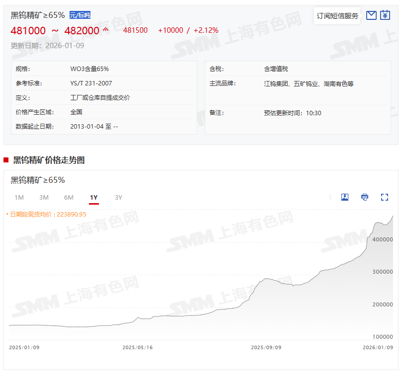 近来钨价连番上行,其在2025年创下的460500元/标吨均价历史新高也被频繁刷新。1月9日,黑钨精矿(≥65%)价格为481000~482000 元/标吨,均价报481500元/标吨,较前一交易日上涨2.12%。