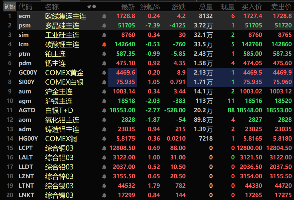 此外,截至午间收盘,铂主连期货跌0.99%,钯主连期货涨0.92%。