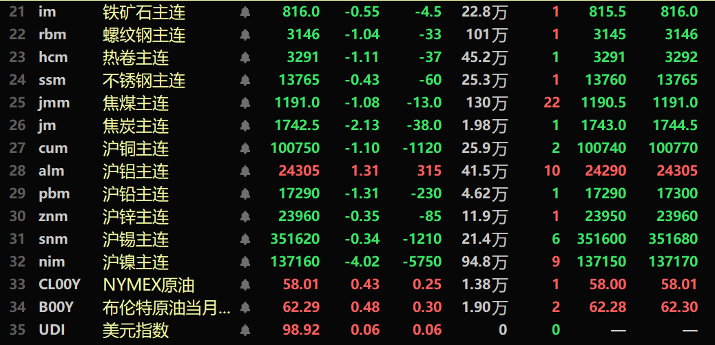 黑色系均飘绿,铁矿跌0.55%,螺纹跌1.04%,热卷跌1.11%,不锈钢跌0.43%。双焦方面:焦煤主力合约跌1.08%,焦炭主力合约跌2.13%。