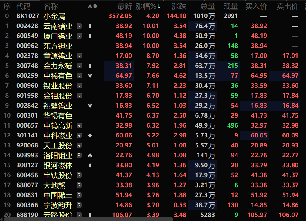 节后归来,钨价受多重利好因素共振提振:市场对节后补库需求的预期持续升温,钨原料现货供应维持偏紧格局,叠加多家钨冶炼企业相继上调长单报价,多重支撑下,钨价自1月6日起再度开启上行通道。此前黑钨精矿在2025年创下的460500元/标吨均价历史新高,也在1月7日至9日期间被连续突破,刷新历史价格纪录。需求端来看,AI、新能源、商业航天三大高景气赛道的需求放量,持续打开小金属品类的成长空间。此外,部分市场资金对有供给收缩预期的战略小金属的青睐等也带动小金属板块的飙升。截至1月9日10:36分,小金属行业大涨4.2%,个股方面:云南锗业、厦门钨业、东方钽业涨停,章源钨业、金力永磁、中稀有色、锡业股份、金钼股份、翔鹭钨业以及华锡有色等涨幅居前。
