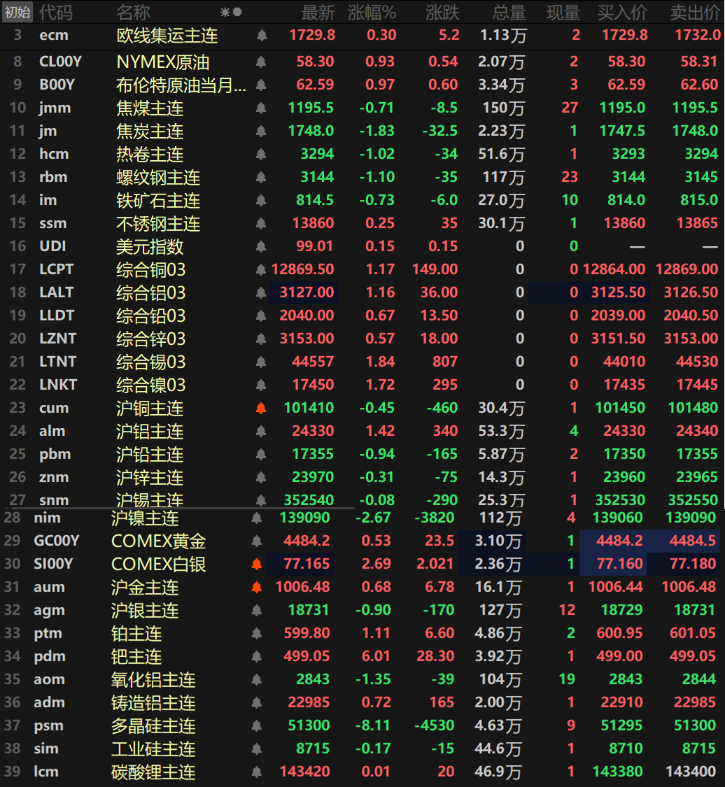 此外,碳酸锂主连涨0.01%,工业硅主连跌0.17%,多晶硅主连继续下挫,跌8.11%。欧线集运主连涨0.3%报1729.8。