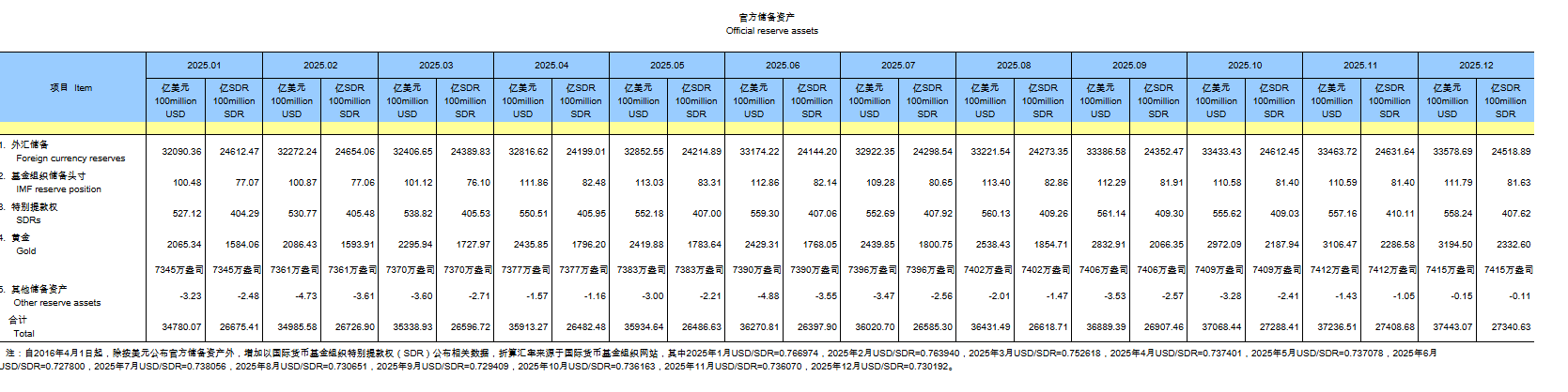 2025年12月,受主要经济体货币政策、宏观经济数据等因素影响,美元指数下跌,全球金融资产价格涨跌互现。汇率折算和资产价格变化等因素综合作用,当月外汇储备规模上升。我国不断巩固拓展经济稳中向好势头,经济长期向好的支撑条件和基本趋势没有改变,有利于外汇储备规模保持基本稳定。