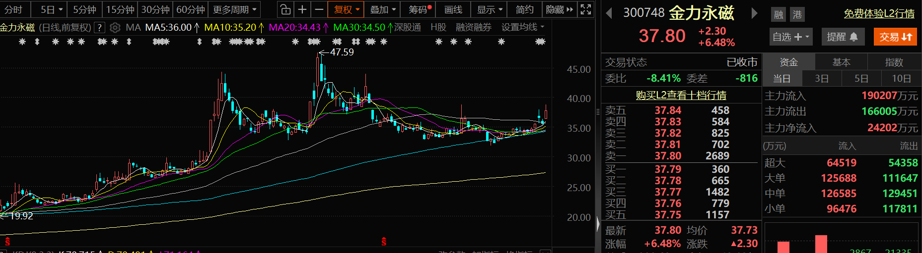 1月9日,金力永磁的股价出现明显上涨,截至9日收盘,金力永磁涨6.48%,报37.8元/股。