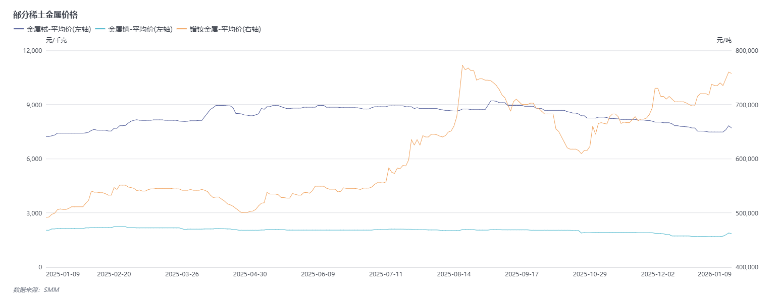 据SMM最新的报价显示:1月9日,镨钕金属价格下调至75-76.5万元/吨,金属镝报价下调至183~187 万元 / 吨,金属铽报价下调至765-775万元/吨。