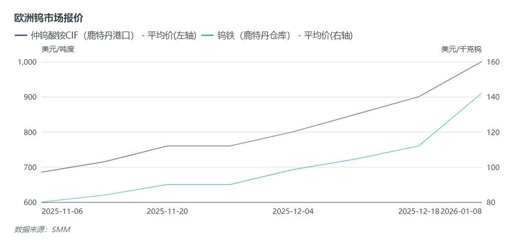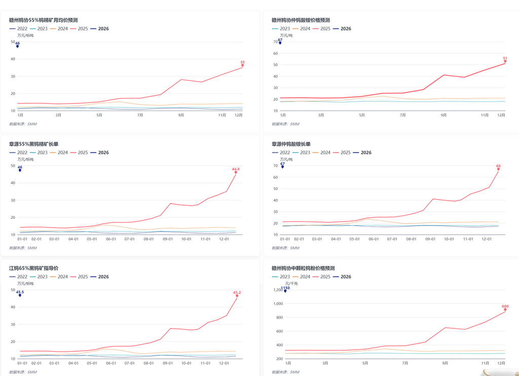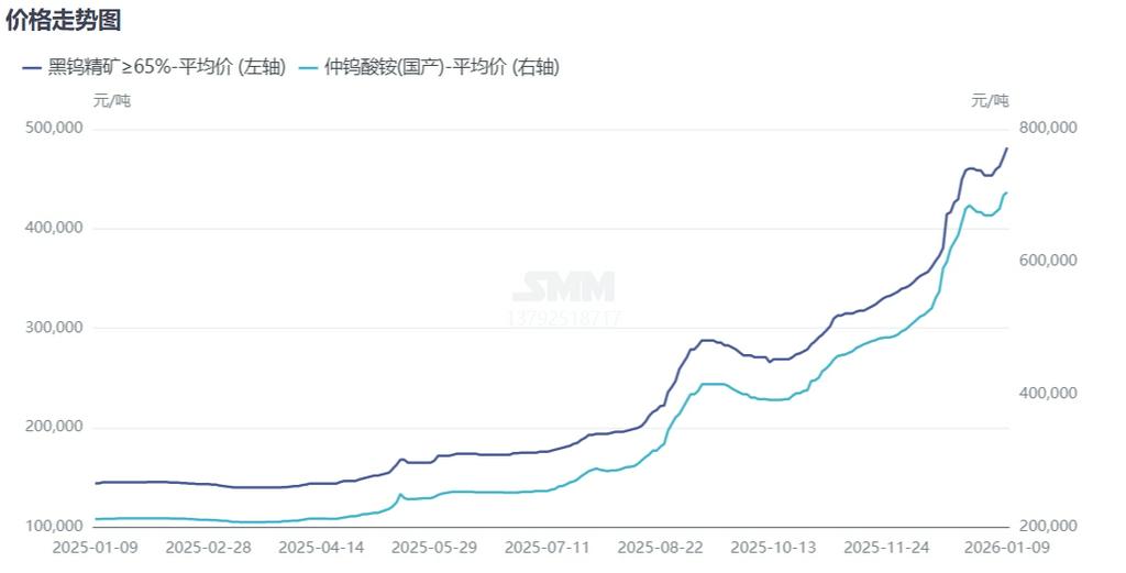 1月初,国内主流钨企业多上调1月上半月长单价格,其中55%钨精矿长单价格多集中在46万附近,APT价格多集中67万元/吨,赣州钨协1月份钨粉价格预期给到1150元/千克,龙头企业及机构一致性上调,提振市场信心。