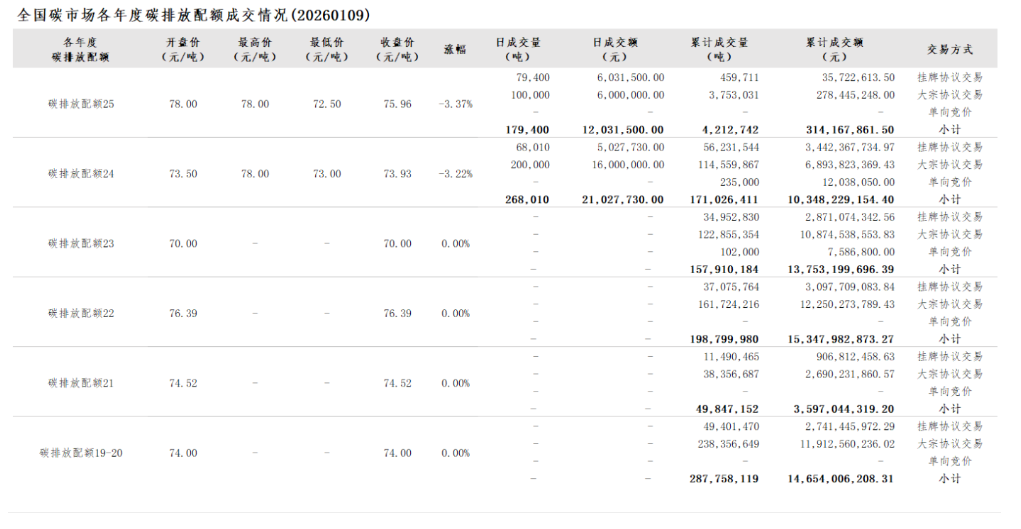 2026年1月1日至1月9日,全国碳市场碳排放配额成交量4,688,068吨,成交额352,011,881.50元。