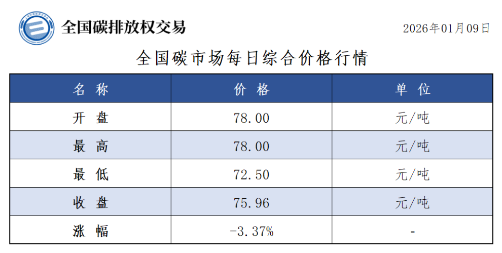 今日全国碳市场综合价格行情为: 开盘价78.00元/吨,最高价78.00元/吨,最低价72.50元/吨,收盘价75.96元/吨,收盘价较前一日下跌3.37%。