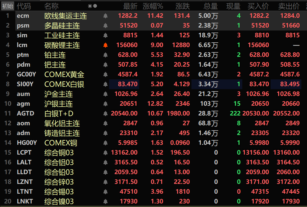 贵金属方面,截至11:48分,COMEX黄金涨1.92%,盘中刷新历史新高至4612.7美元/盎司;COMEX白银涨5.2%,盘中刷新历史新高至83.905美元/盎司。内盘贵金属方面:沪金主连涨2.64%,盘中刷新历史新高至1031.3元/克;沪银主连涨12.82%,盘中刷新历史新高至20685元/千克。