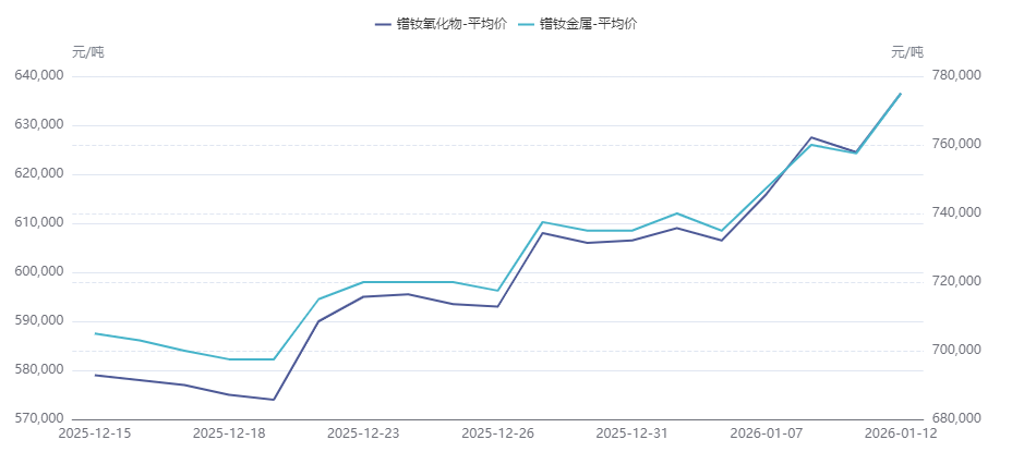 SMM1月12日讯:2026年1月上旬,国内氧化镨钕市场价格呈现快速拉涨态势,报价攀升至64万元/吨,较元旦前累计上涨约3万元/吨。此番价格上涨是成本支撑、供应紧张与市场情绪共同作用的结果,但下游需求的疲软也同时制约了价格的持续上行空间,市场预计将进入高位震荡阶段。