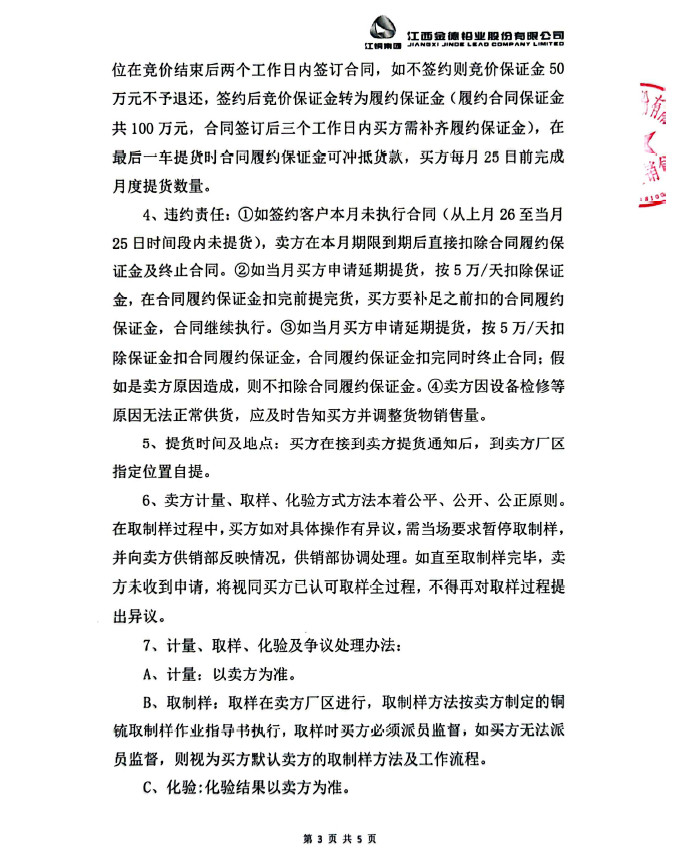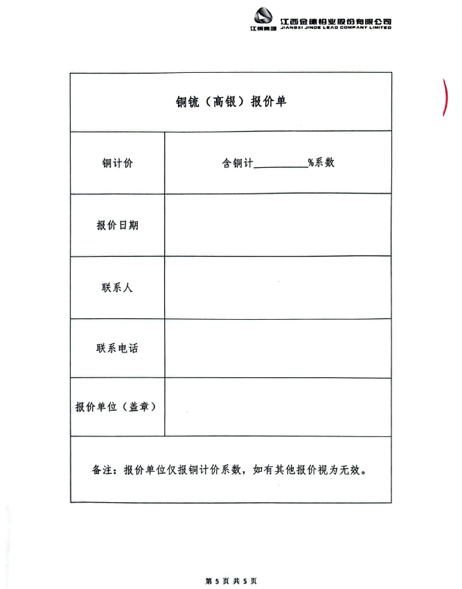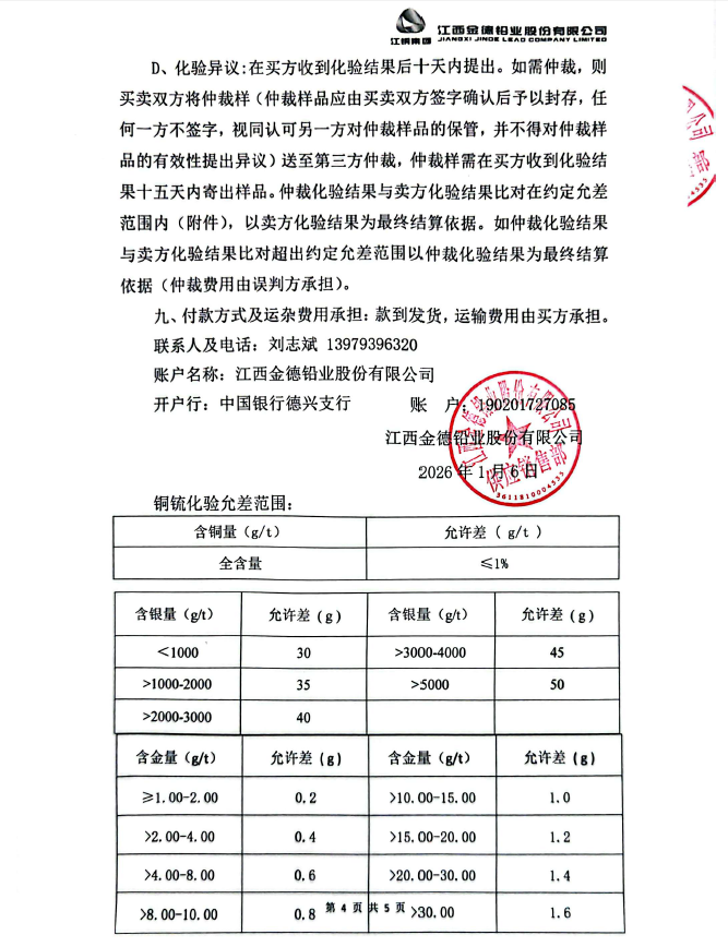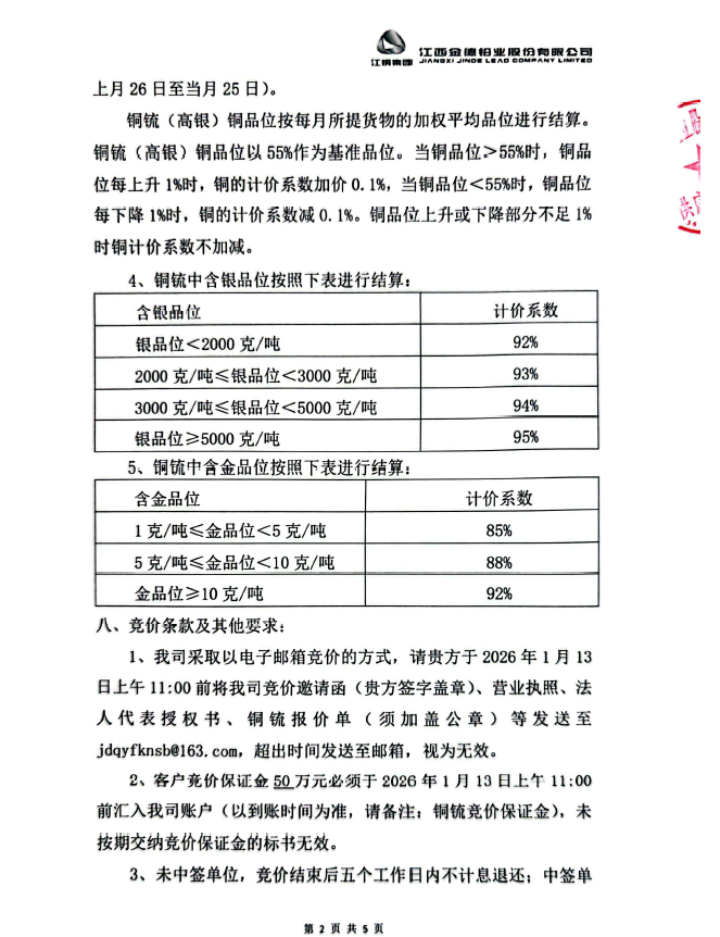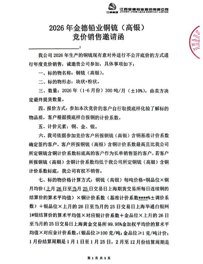 近期,江西金德铅业股份有限公司发布2026年金德铅业铜锍(高银)竞价销售邀请函,销售数量为2026年(1-6月份)300吨/月(士10%),由卖方决定最终提货数量。参加本次竞价的客户自行取摸底样化验了解标的物品质,客户根据摸底样自报铜的计价系数。