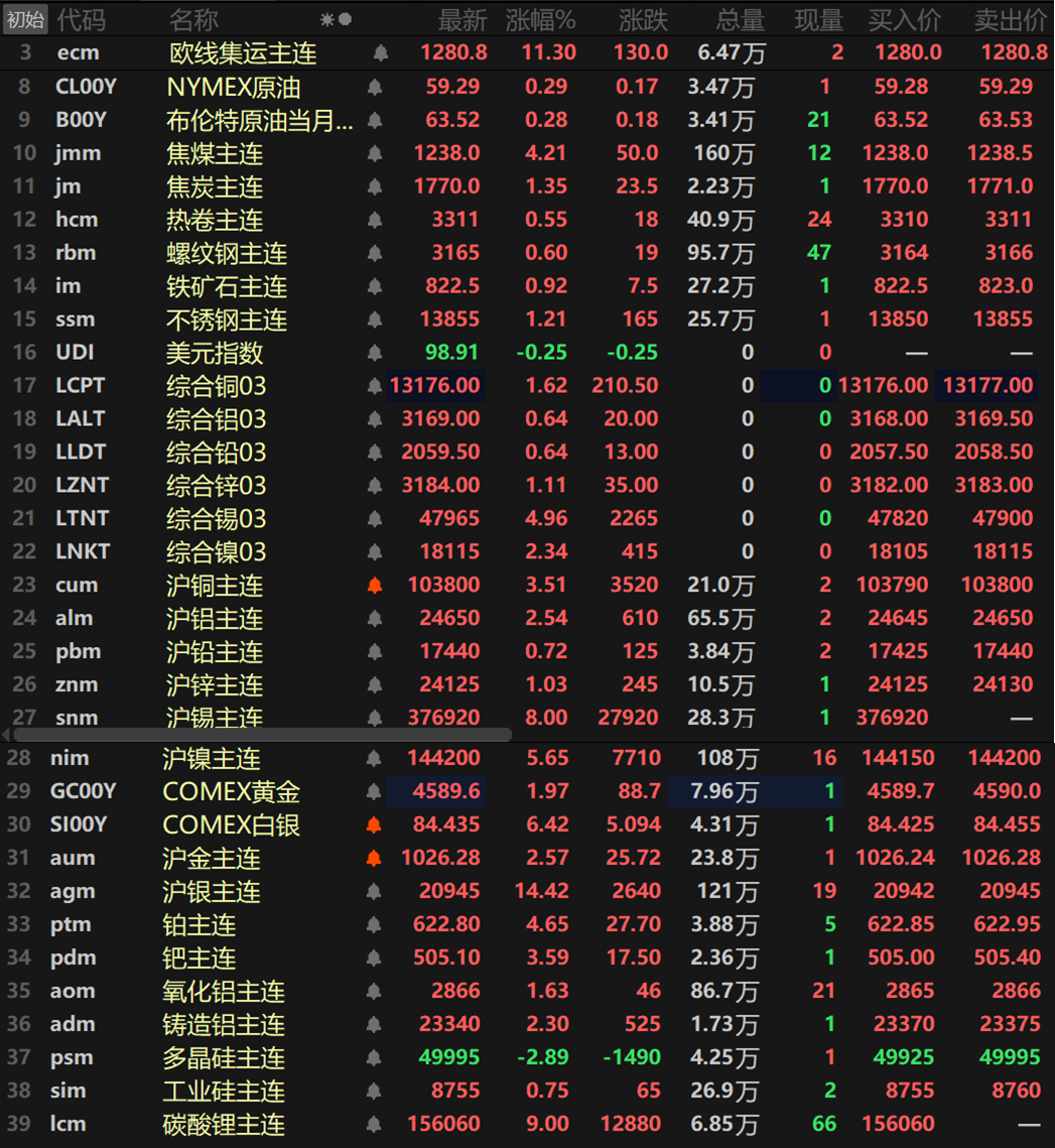 贵金属方面,截至15:03分,COMEX黄金涨1.97%,其盘中最高冲至4612.7美元/盎司,继续刷新其上市以来的历史新高;COMEX白银涨6.42%,其盘中最高触及84.69美元/盎司,同样刷新其上市以来的历史记录;国内方面,沪金涨2.57%,盘中最高触及1031.3元/克,继续刷新其历史记录;沪银大涨14.42%,盘中最高冲至20998元/千克,成功站稳2万元整数关口。