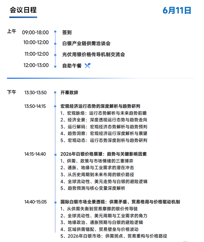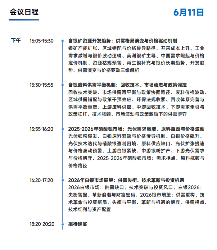 叠加中国“双碳”目标推进与全球ESG投资浪潮,白银产业在绿色生产、循环利用及低碳技术应用上的需求愈发迫切。国家发改委《“十四五”循环经济发展规划》已明确提出加强贵金属资源循环利用,而国际银价波动与地缘政治风险,进一步倒逼企业提升供应链自主可控能力。在此产业变革与政策导向叠加的背景下,2026 SMM(第七届)白银产业链创新大会定于6月11日-12日在江苏•昆山隆重举行!