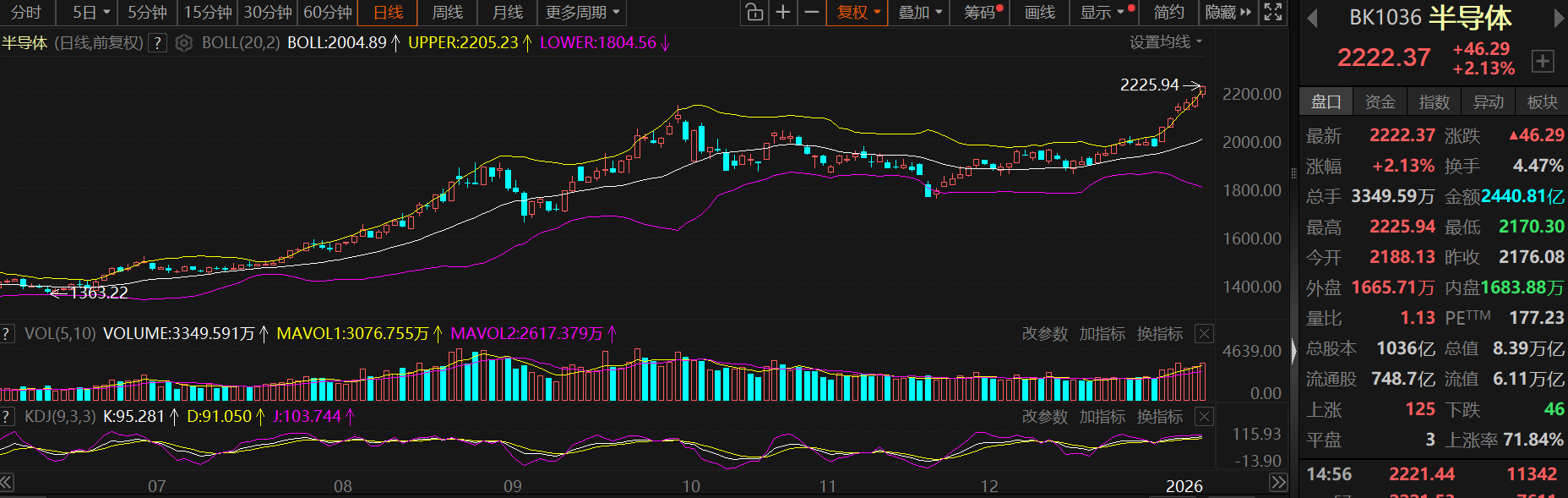 SMM 1月12日讯:1月12日,在市场情况一片大好的情况下,半导体板块再度走高,其指数盘中一度涨逾2%,截至日间收盘,半导体板块以2.13%的涨幅报2222.37,其指数盘中一度攀升至2225.94,刷新其上市以来的历史新高。