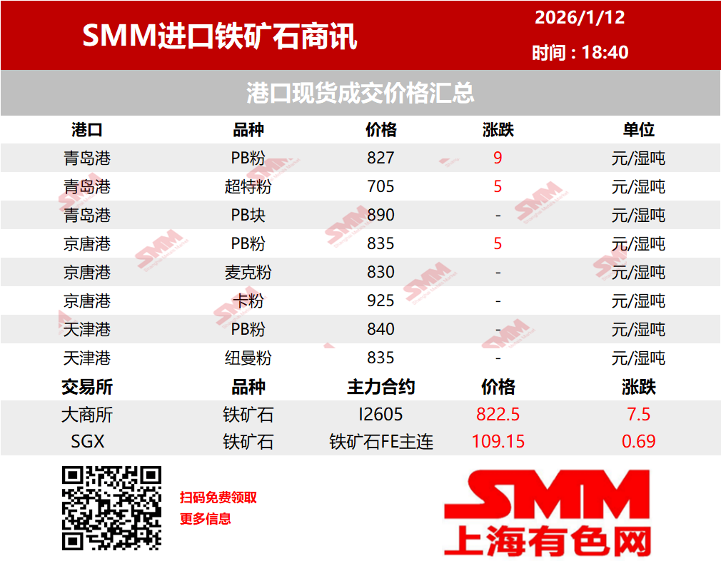 【SMM铁矿价格】今日铁矿石价格较昨日上涨5-10元。山东主要港口PB粉827元,超特粉705元;河北主要港口PB粉835元,麦克粉830元;天津港PB粉840元,纽曼粉835元。【SMM铁矿】