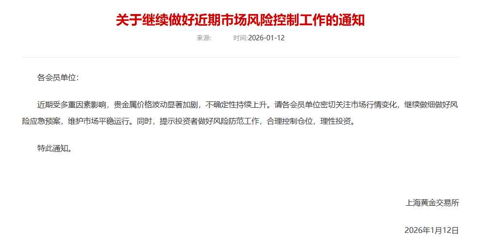 上金所发布通知,近期受多重因素影响,贵金属价格波动显著加剧,不确定性持续上升。请各会员单位密切关注市场行情变化,继续做细做好风险应急预案,维护市场平稳运行。同时,提示投资者做好风险防范工作,合理控制仓位,理性投资。