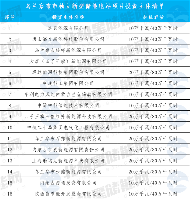其中运达能源科技集团股份有限公司、四子王旗三信红升新能源科技有限公司、乌兰察布万邦新能源有限公司、内蒙古京辰新能源有限责任公司、上海融远见新能源科技有限公司、乌兰察布云储新能源有限公司中选规模均为200MW/800WMh;远景能源有限公司、唐山海泰新能科技股份有限公司、乌兰察布核祥新能源有限公司、大唐(四子王旗)新能源有限公司、中建科工集团有限公司、华润电力风能内蒙古巴音锡勒有限公司、中绿中科储能技术有限公司、中铁二十局集团电气化工程有限公司、内蒙古源通投资有限公司、陕西省节能开发投资有限公司中选规模均为100MW/400WMh。