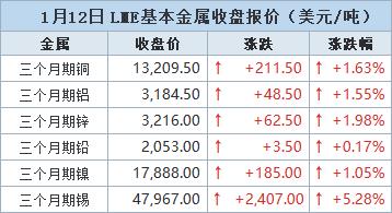 伦敦时间1月12日17:00(北京时间1月13日01:00),LME三个月期铜上涨211.5美元,或1.63%,收报每吨13,209.5美元。