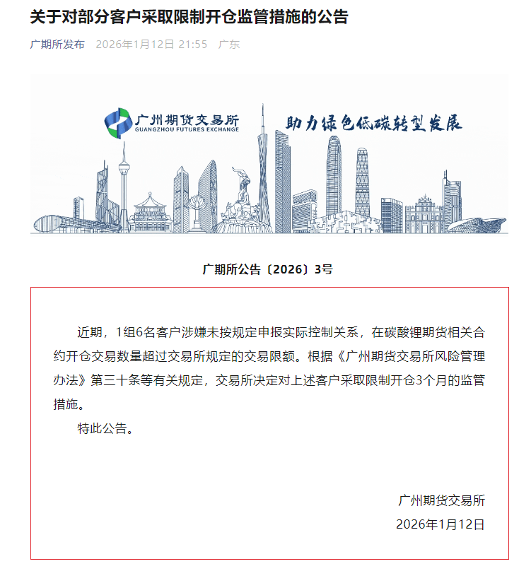 值得一提的是,1月12日,广期所发布发布自律监管通知,对1组6名涉嫌未按规定申报实际控制关系,在碳酸锂期货相关合约上开仓数量超过交易限额的客户,依据《广州期货交易所风险管理办法》等规定,采取限制开仓3个月的监管措施。》点击查看详情