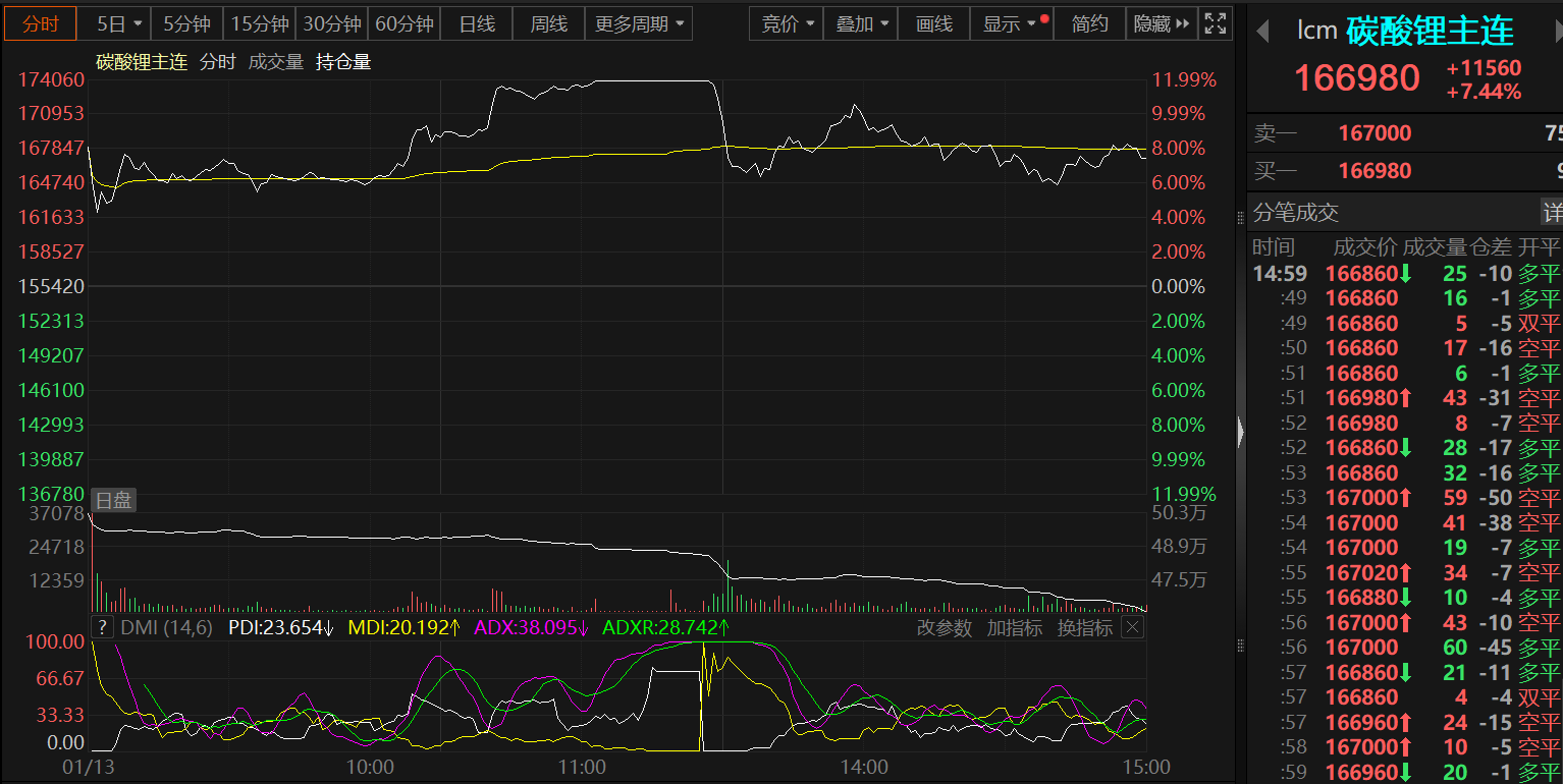 SMM 1月13日讯:2026年开年,国内有色金属市场形势整体呈现一片大好的态势,贵金属价格更是一路飙升屡刷新高,在此背景下,碳酸锂期货涨势也十分可观,1月12日、1月13日更是接连跳空高开,在1月12日涨停封板之后,1月13日临近午间收盘,碳酸锂期货一度涨11.99%再度封死涨停板,盘中最高冲至174060元/吨的高位,刷新2023年10月以来的新高;但午间收盘前几分钟涨停板打开,截至日间收盘,碳酸锂主连以7.44%的涨幅报166980元/吨。