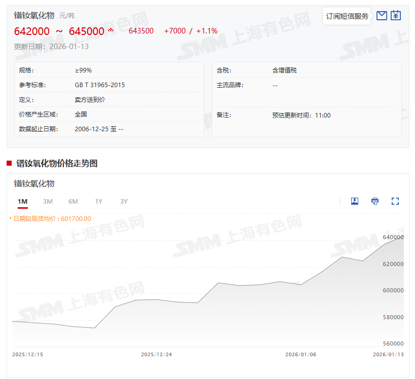 据SMM报价显示,镨钕产品的价格已经连续2个交易日出现上涨。其中,氧化镨钕1月13日的价格为642000~645000元/吨,其均价为643500元/吨,较前一交易日上涨1.1%。
