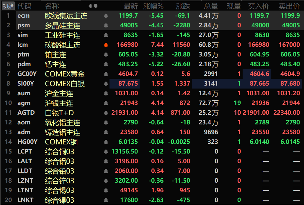 隔夜贵金属方面:COMEX黄金跌0.44%,盘中刷新历史新高至4644美元/盎司;COMEX白银涨2.08%,盘中刷新历史新高至89.125美元/盎司。内盘贵金属方面:沪金主连涨0.14%,盘中刷新历史新高至1038.7元/克;沪银主连涨4.14%,盘中刷新历史新高至22446元/千克。