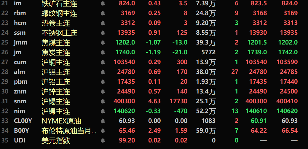 隔夜黑色系多飘红,铁矿涨0.43%,不锈钢涨0.91%,螺纹钢涨0.25%,热卷涨0.09%。双焦方面:焦煤跌1.07%,焦炭跌1.19%。