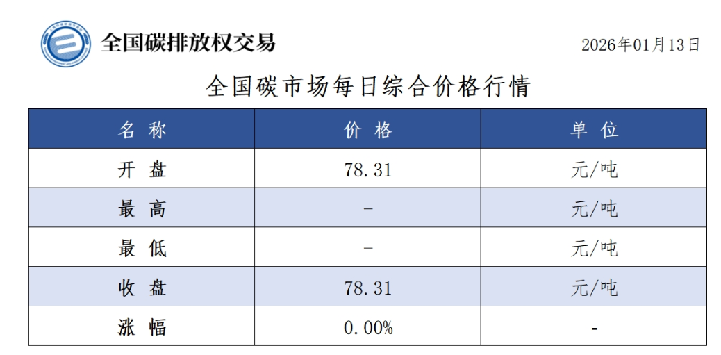 2026年1月1日至1月13日,全国碳市场碳排放配额成交量6,201,998吨,成交额452,015,978.20元。
