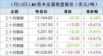 伦敦时间1月13日17:00(北京时间1月14日01:00),LME三个月期铜下跌45.5美元,或0.34%,收报每吨13,164.0美元。