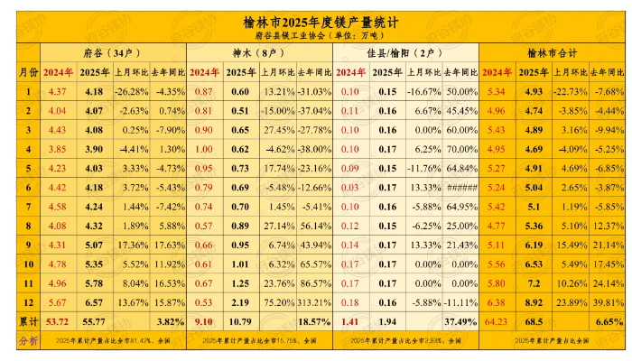 1至12月份镁产量55.77万吨,较2024年53.72万吨增加2.05万吨,增长3.82%。其中,12月份镁产量6.57万吨,环比13.67%,同比15.87%。