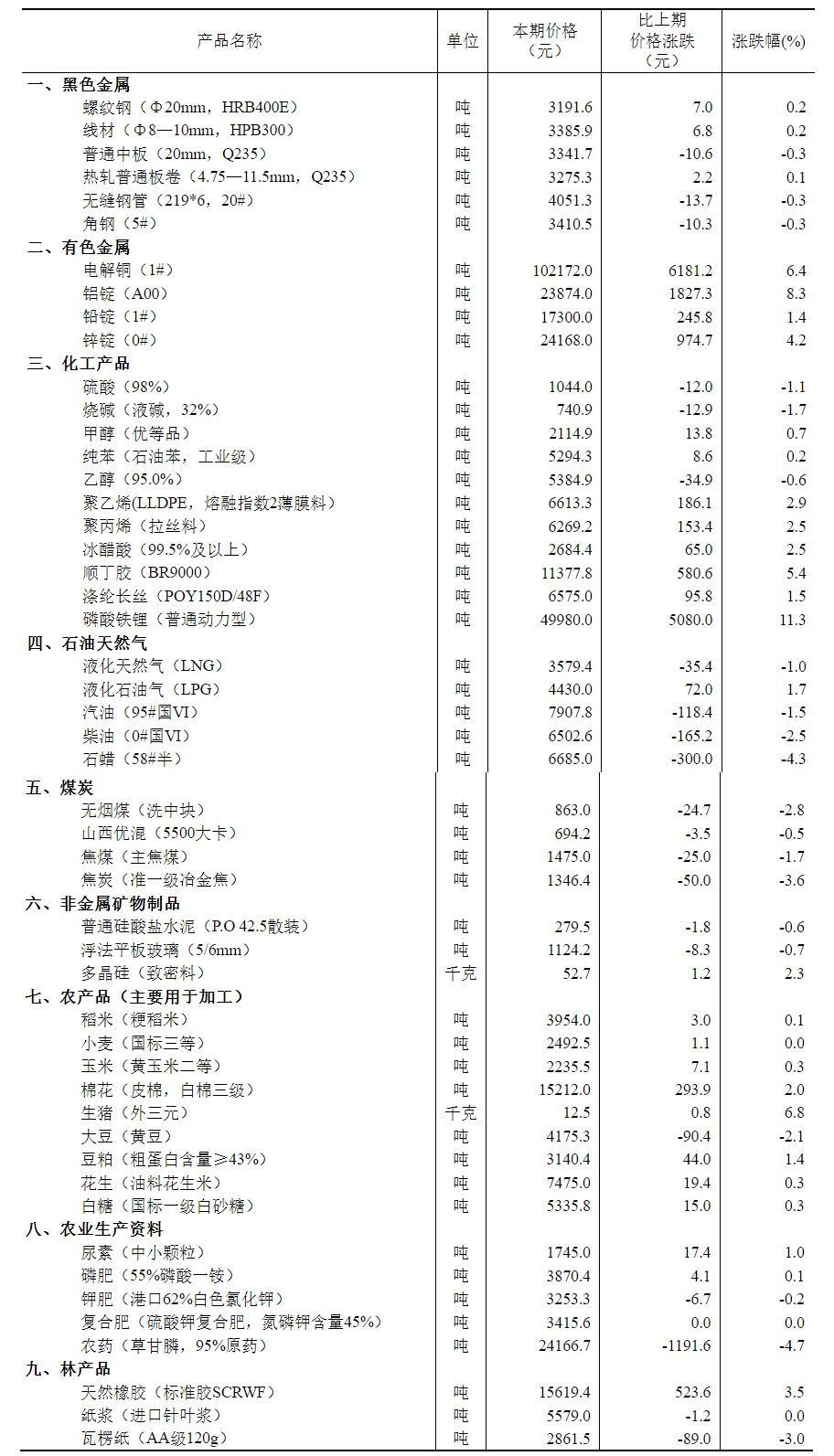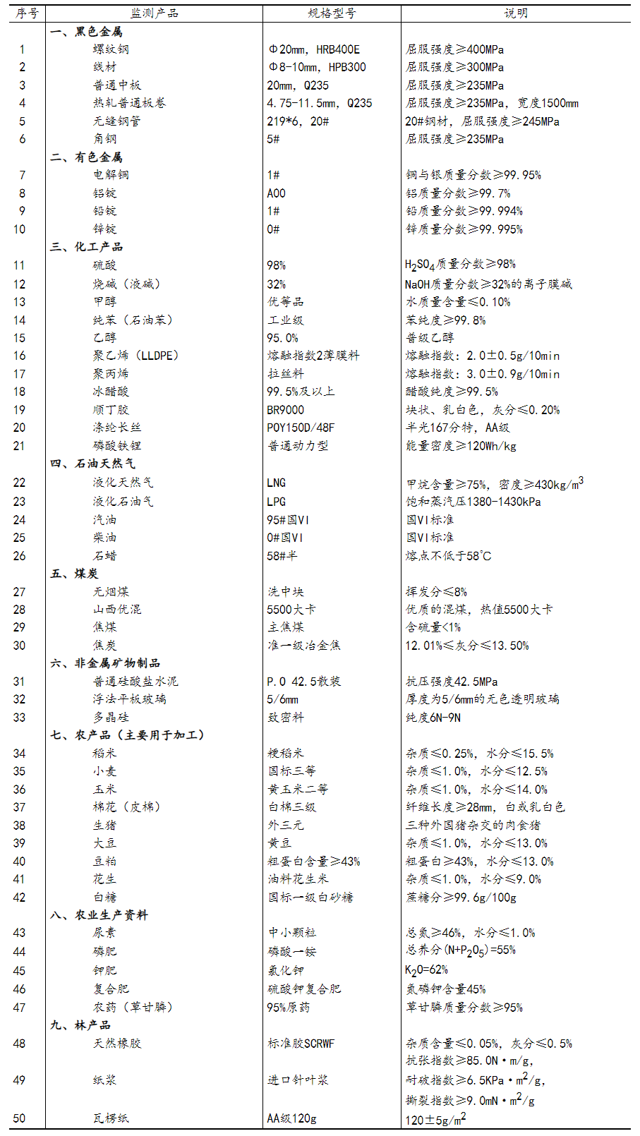 流通领域重要生产资料市场价格监测内容包括9大类50种产品的价格。类别与产品规格说明详见附表。