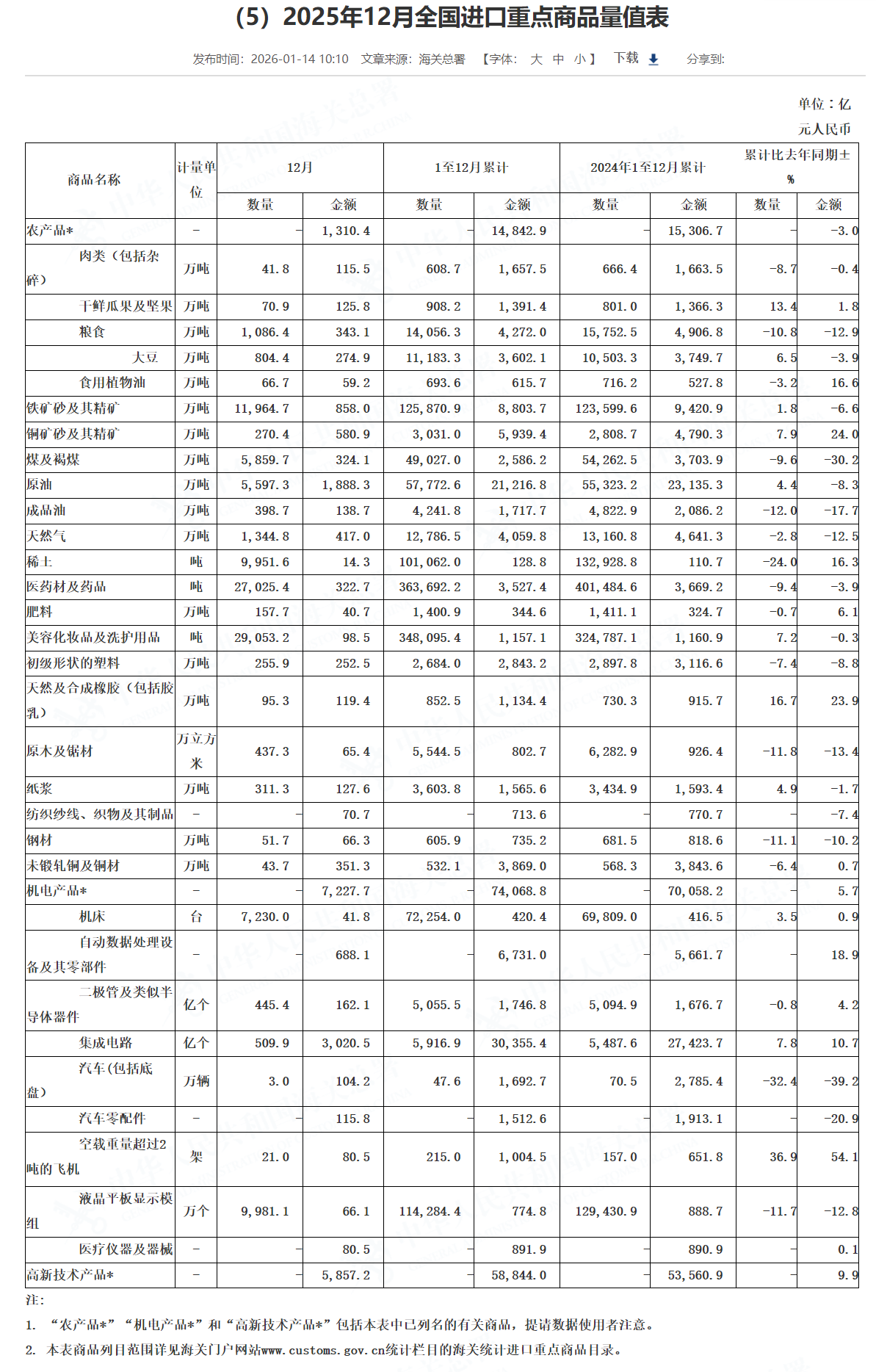 海关总署1月14日发布数据显示,2025年,我国货物贸易进出口总值45.47万亿元,同比增长3.8%,自2017年起连续9年保持增长。其中,出口顶住逆风逆流,规模达到26.99万亿元,同比增长6.1%;进口18.48万亿元,规模创历史新高,同比增长0.5%,将连续17年成为全球第二大进口市场。2025年是“十四五”收官之年,回顾“十四五”时期我国外贸发展,累计进出口规模突破200万亿元,比“十三五”时期增长四成,年均增长7.1%。