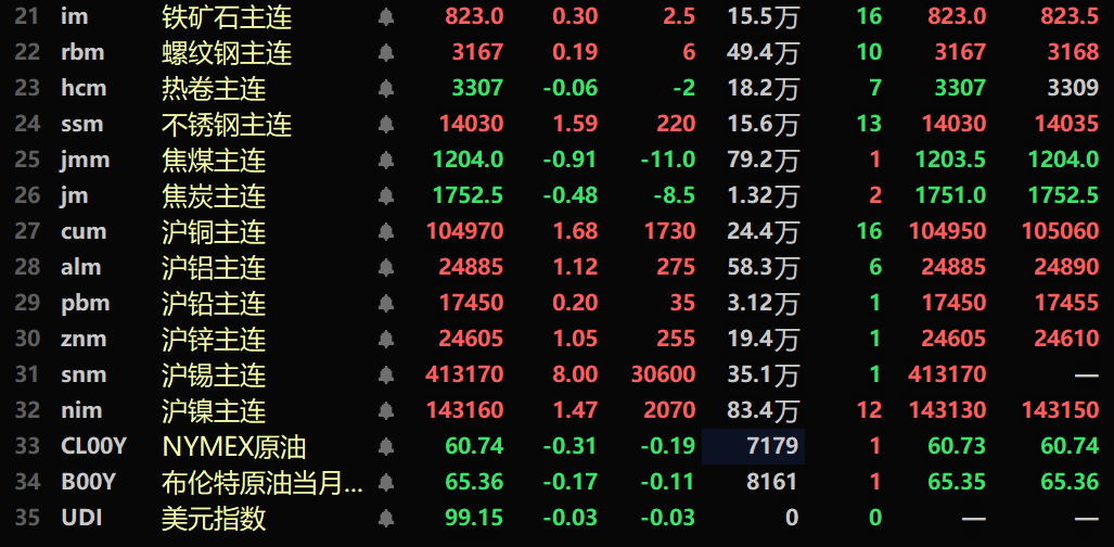 截至午间收盘,内盘基本金属全线上涨,沪铜涨1.68%,盘中刷新历史新高至105650元/吨。沪铝涨1.12%。沪铅涨0.2%,沪锌涨1.05%。沪锡以8%的涨幅涨停,盘中刷新历史新高至413170元/吨。沪镍涨1.47%。