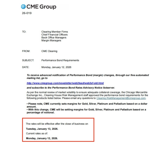 当地时间2026年1月12日,芝商所再度发布通知,调整其旗下贵金属期货合约的保证金收取方式。
