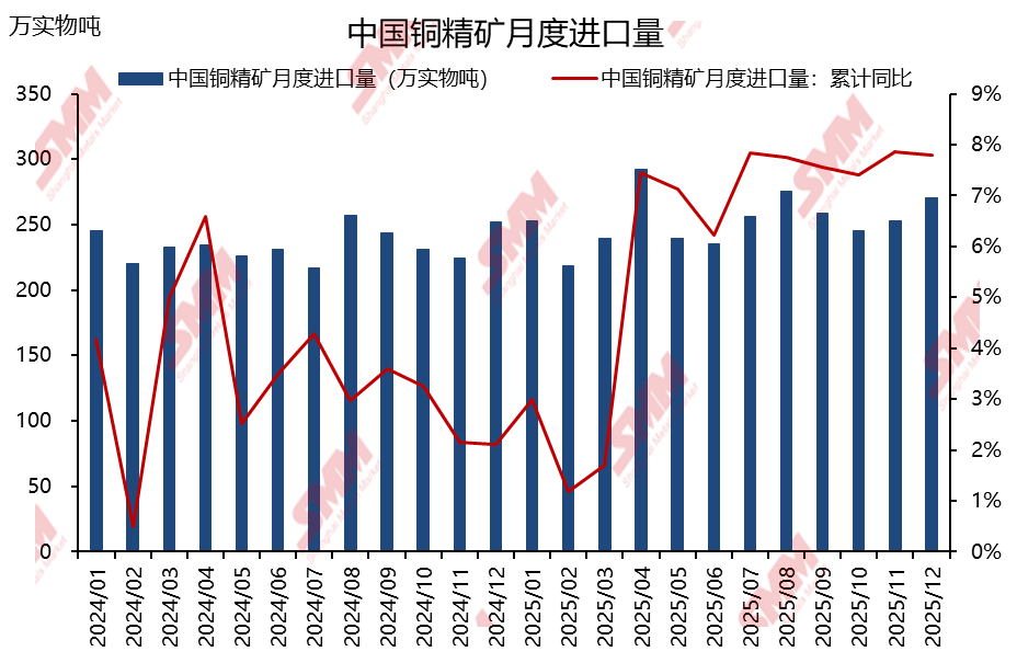 据海关总署数据显示:2025年12月中国进口铜矿砂及其精矿270.4万实物吨,环比增加7%,同比增加7.2%;1-12月中国累计进口铜矿砂及其精矿3036.5万实物吨,累计同比增加7.8%。2025年年内铜精矿进口量多次创下历史进口量新高,2025年4月中国进口铜矿砂及其精矿292.4万实物吨为历史第一高,2025年8月中国进口铜矿砂及其精矿275.9万实物吨为历史第二高,2025年12月中国进口铜矿砂及其精矿270.4万实物吨为历史第三高。