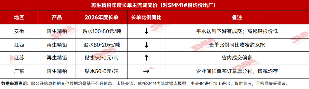 数据对比:2026年主流长单价格对SMM1#铅均价贴水80-20元/吨,较2025年收窄50-0元/吨。