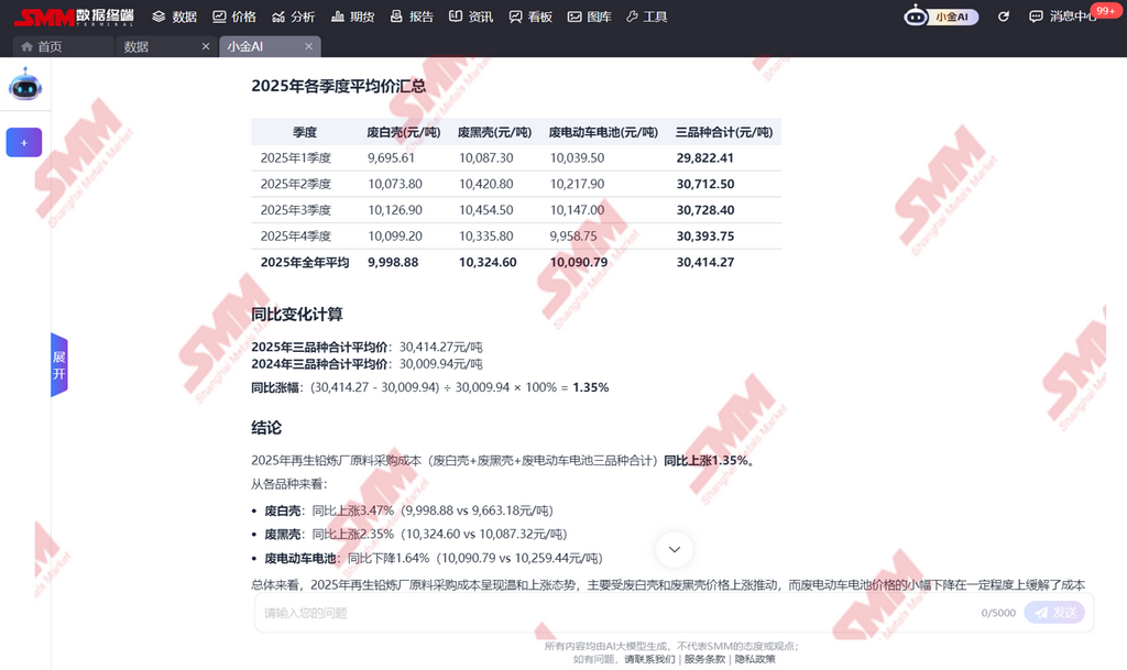 成本分析:废电瓶采购成本同比上涨1.35%(计算过程详见下图-SMM小金AI),挤压冶炼利润。
