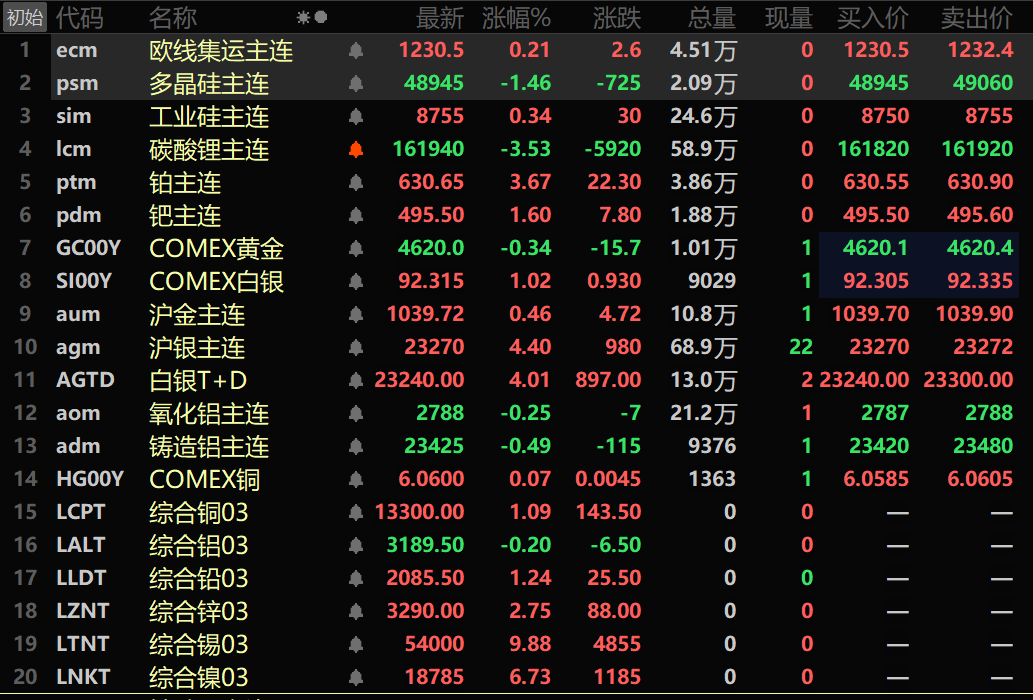 隔夜贵金属方面:COMEX黄金涨0.76%,盘中刷新历史新高至4650.5美元/盎司;隔夜COMEX白银涨7.93%,1月15日盘中刷新历史新高至93.7美元/盎司。内盘贵金属方面:沪金主连涨0.46%,盘中刷新历史新高至1042.94元/克;沪银主连涨4.4%,盘中刷新历史新高至23688元/千克。