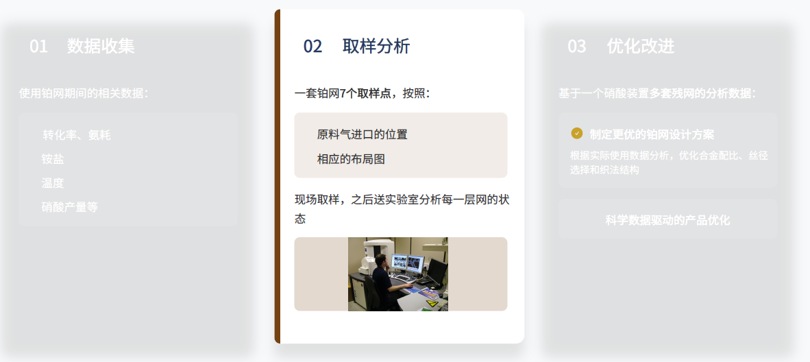 生产:铂网催化剂生产制造;使用:硝酸生产中的催化应用;回收:残网湿法精炼回收贵金属。
