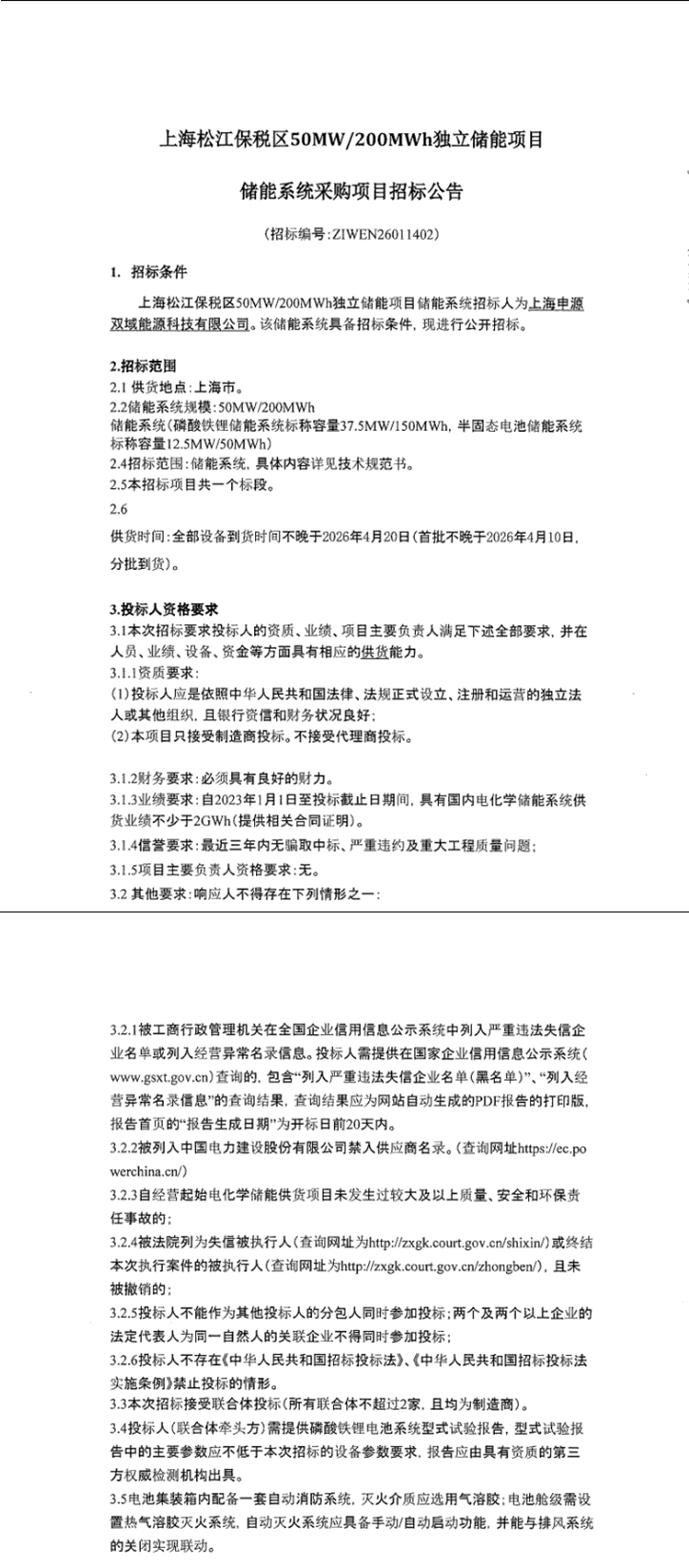 1月14日,上海松江保税区50MW/200MWh独立储能项目储能系统采购项目发布招标公告。