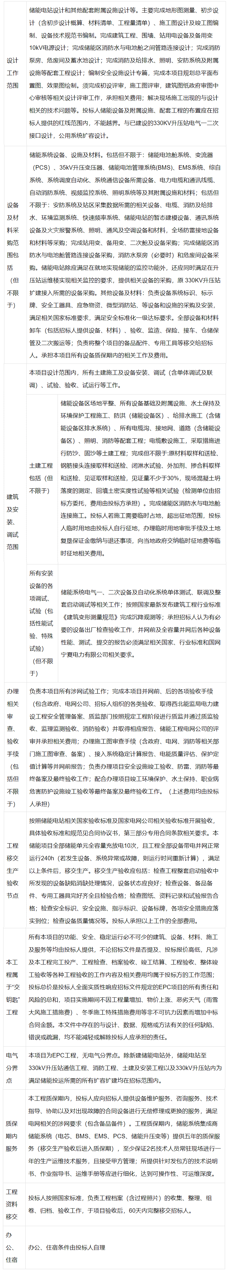 本工程储能系统全部勘察、设计工作,包括但不限于土建、电气等所有专业;投标人提供为了满足国家、行业、国家电网的各项规范要求,保证储能系统正常功能的全部设备和材料的采购供应,场地平整及安装工程施工,项目管理、调试、试运、培训、移交生产,配合办理工程竣工验收、结算、决算,工程质量保修期的服务等全过程的项目 EPC总承包工作。